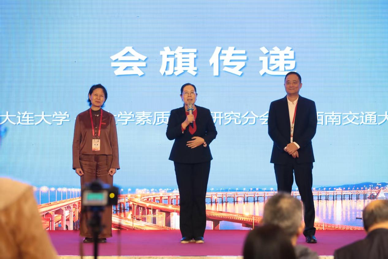 闭幕式由大学素质教育研究分会副理事长、浙江理工大学党委副书记姚珺主持。研究分会监事、中国海洋大学宋文红作会议总结,认为会议充分体现了“高站位”“强学术”“重交流”的办会理念,具有战略前沿性、深度学理性、开放共享性、广泛影响力的“三性一力”的特征。大学素质教育研究会顾问陈怡向2025年学术年会联合主办单位大连大学、北京理工大学颁发特殊贡献牌并发表感言。会旗传递环节,大学素质教育研究分会常务副理事长兼秘书长庞海芍从大连大学副校长李清手中接过会旗,传递给西南交通大学副书记高平平。作为2026年大学素质教育学术年会联合主办单位,高平平讲话热烈欢迎各位同仁明年相聚西南交通大学。